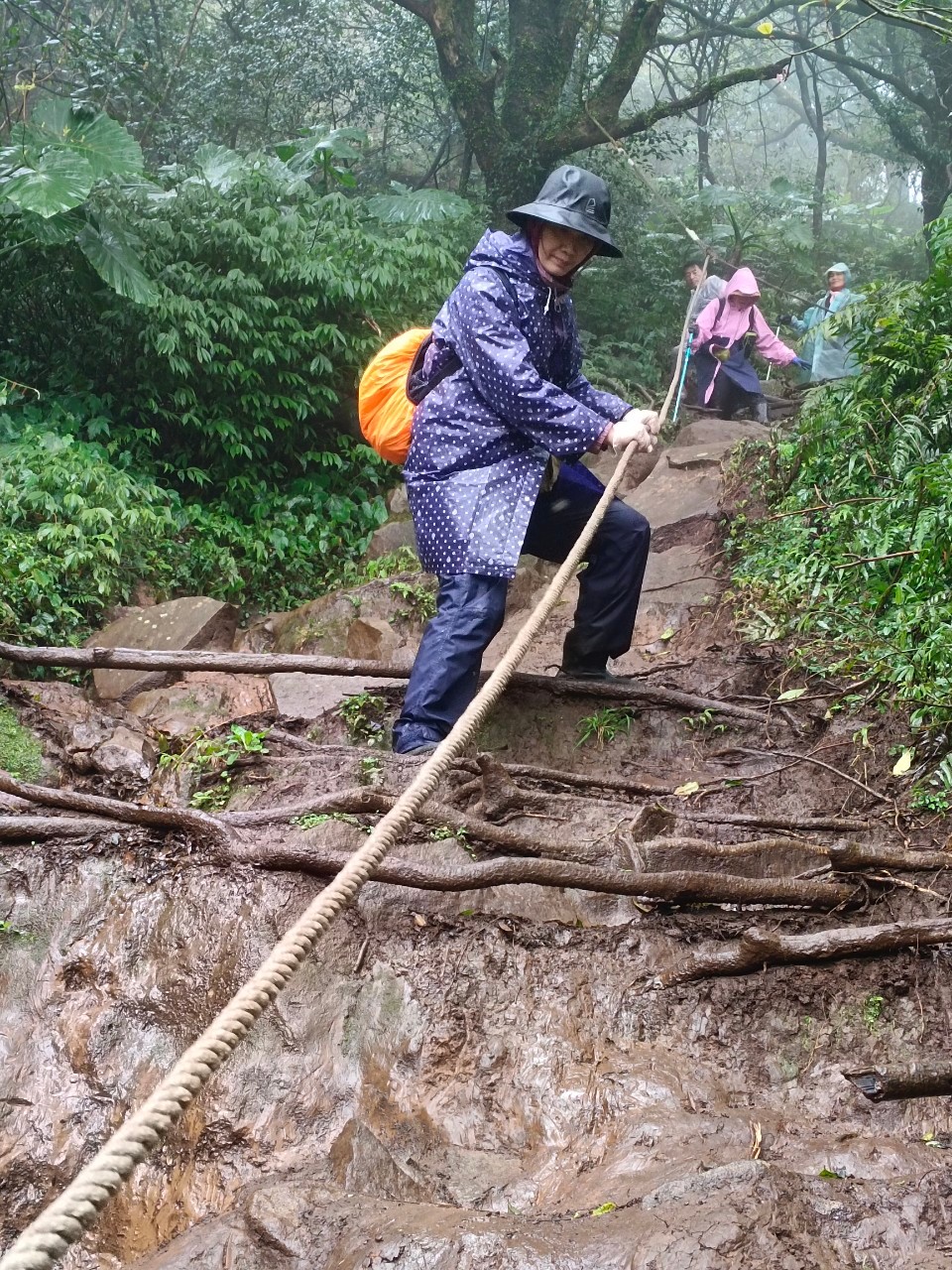 陰雨日山路泥濘,攀繩而行需著防滑雨鞋較為安全(林坤明攝) |