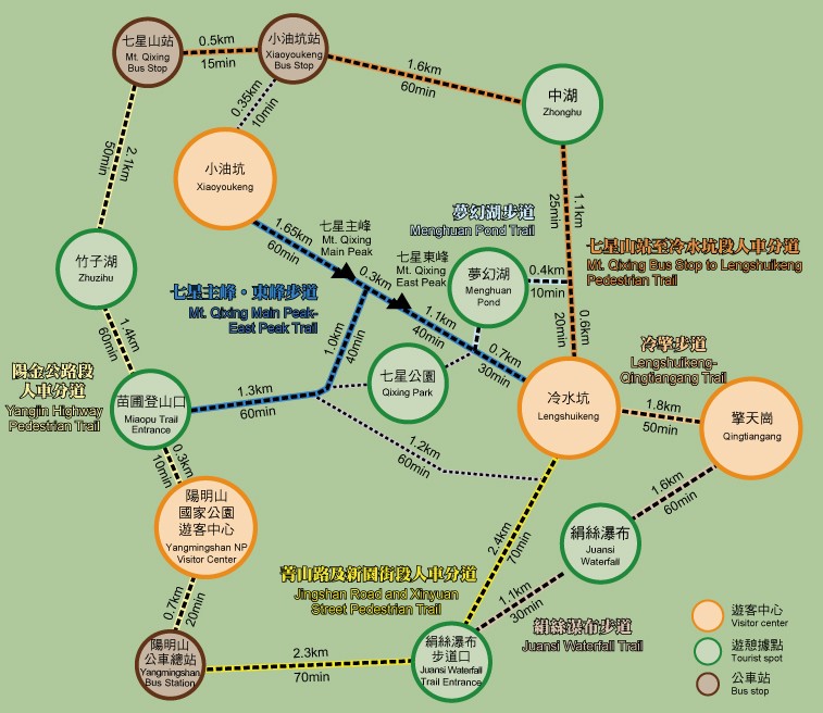 環七星山人車分道路線:陽明山總站→陽金公路→百拉卡公路入口→中湖戰備道路→菁山路101巷→菁山路101巷71弄→中山樓→陽明山總站。自行開車可利用沿途停車場,搭配108遊園公車暢遊。